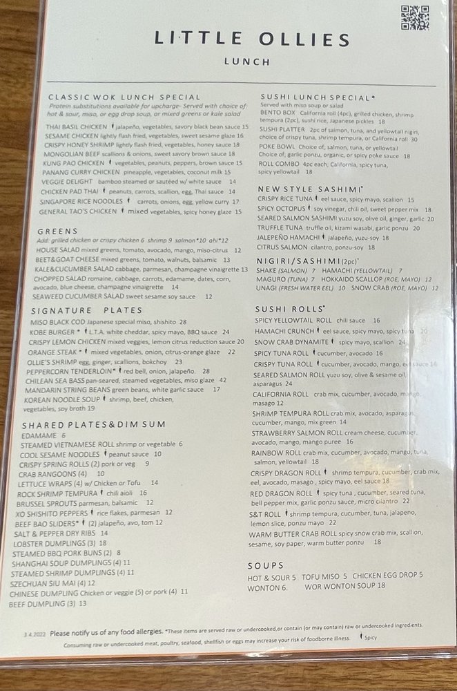 Little Ollies Cherry Creek offers a diverse menu with many vegetarian options and Asian-inspired dishes. The restaurant provides a casual atmosphere with friendly service and a welcoming vibe. Customers rave about the hot and sour soup, chicken egg drop soup, Drunken Noodles, Egg Drop Soup, General Tso's chicken, sushi, edamame, and wok plates. The lychee martini is a standout cocktail choice, and the food is prepared using quality ingredients without MSG. The staff is attentive and accommodating, making the dining experience enjoyable. With a variety of parking options, wheelchair accessibility, and gender-neutral restrooms, Little Ollies Cherry Creek ensures a comfortable and inclusive environment for all diners. Whether you're looking for a casual lunch, a special anniversary dinner, or a fun night out with friends, Little Ollies Cherry Creek is a must-visit destination in Denver.